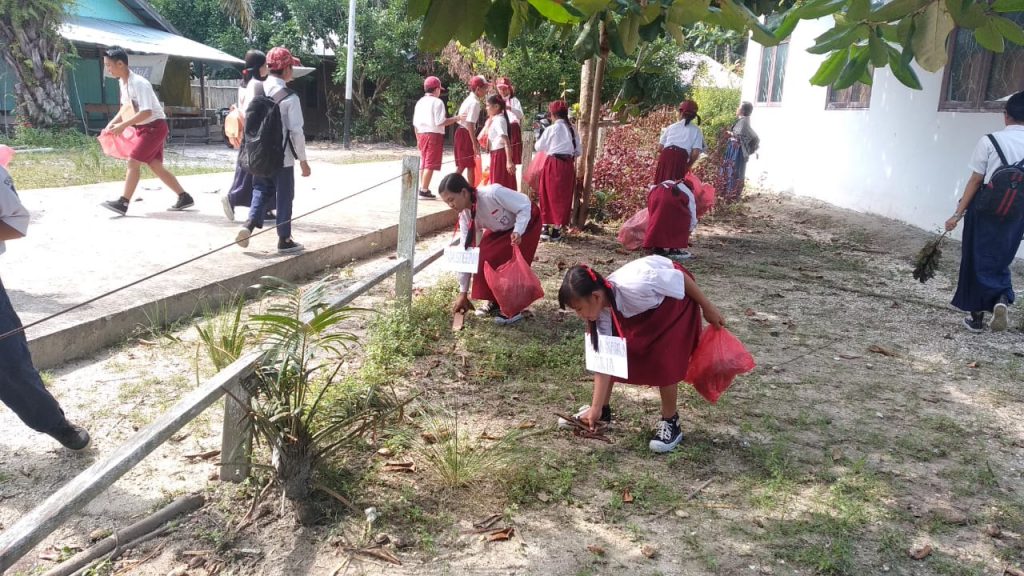 Peserta didik baru bergotong royong dalam membersihkan lingkungan sekolah | Foto: M. Amin Murtadho, Ketapang