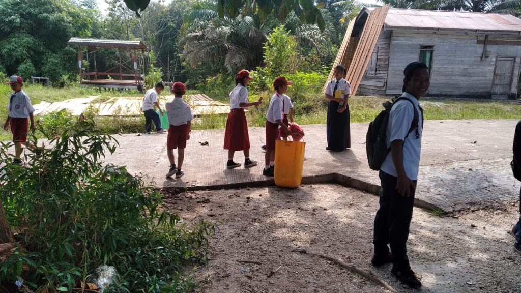 Peserta didik sedang gotong royong menyapu halaman | Foto : M. Amin Murtadho, Ketapang